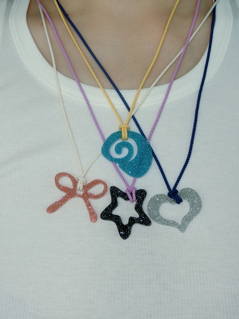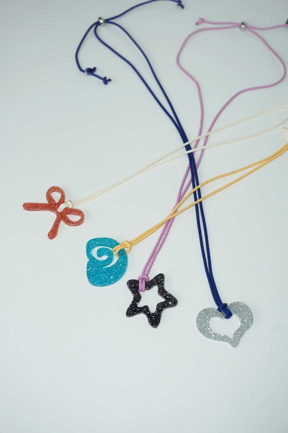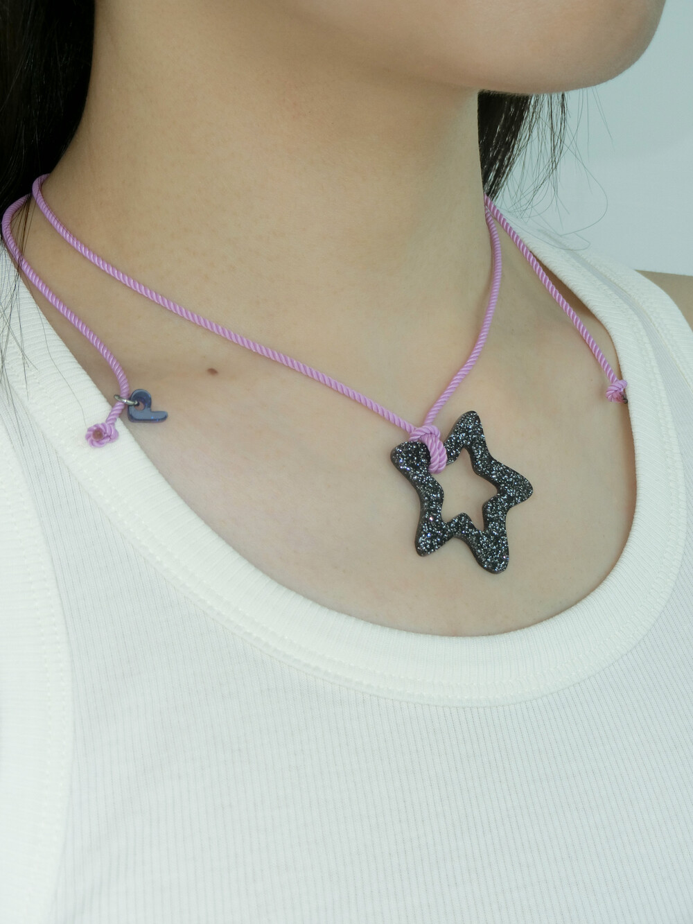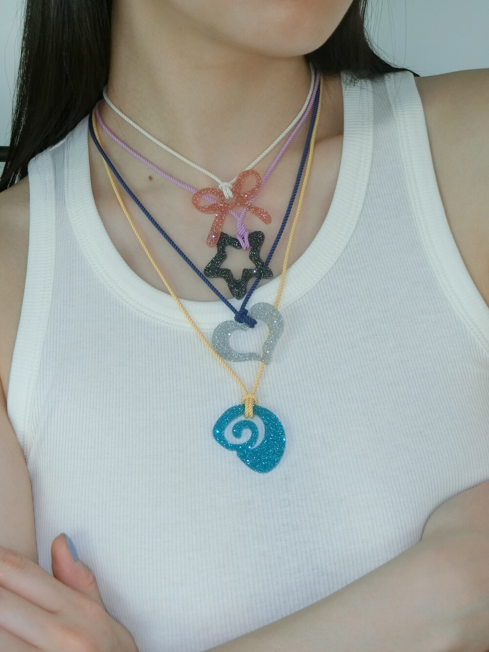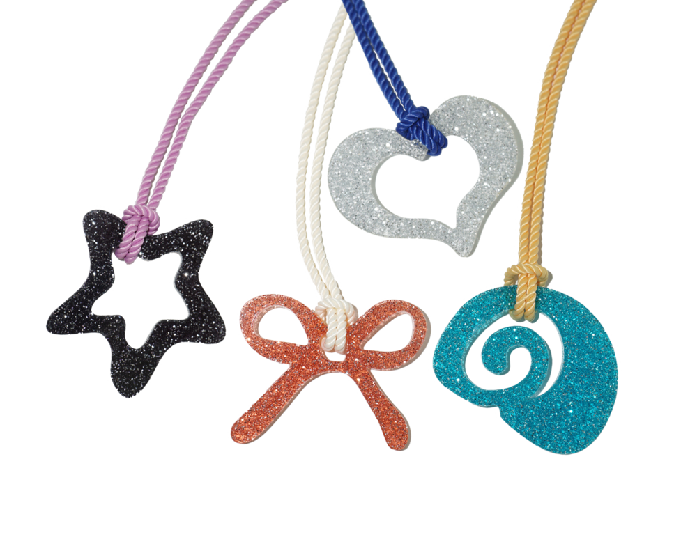 가벼운 소재의 글리터 아크릴로 제작 된 끈 목걸이입니다. 길이 조절이 가능하여 다양하게 연출할 수 있습니다.