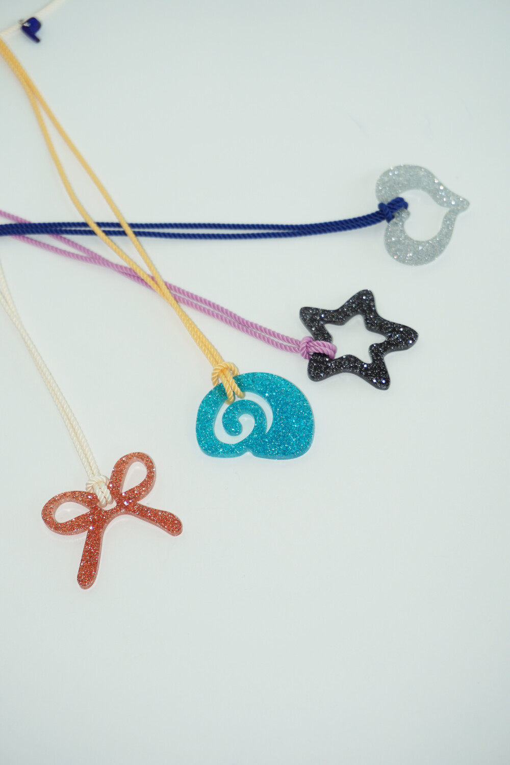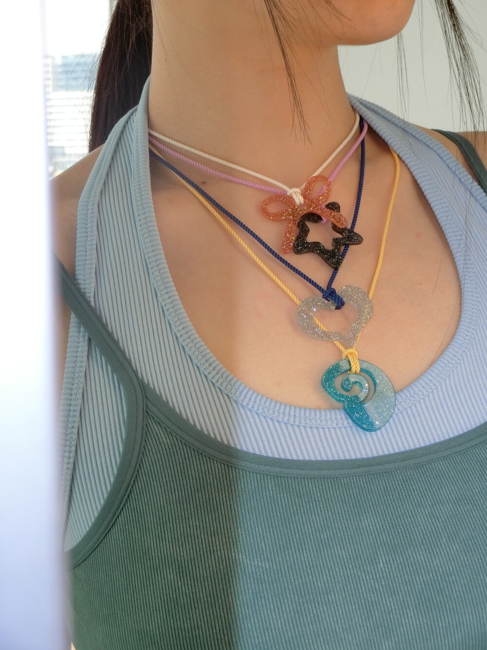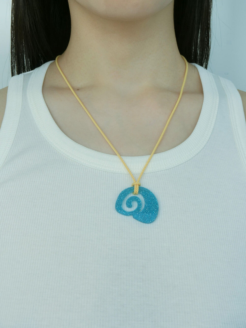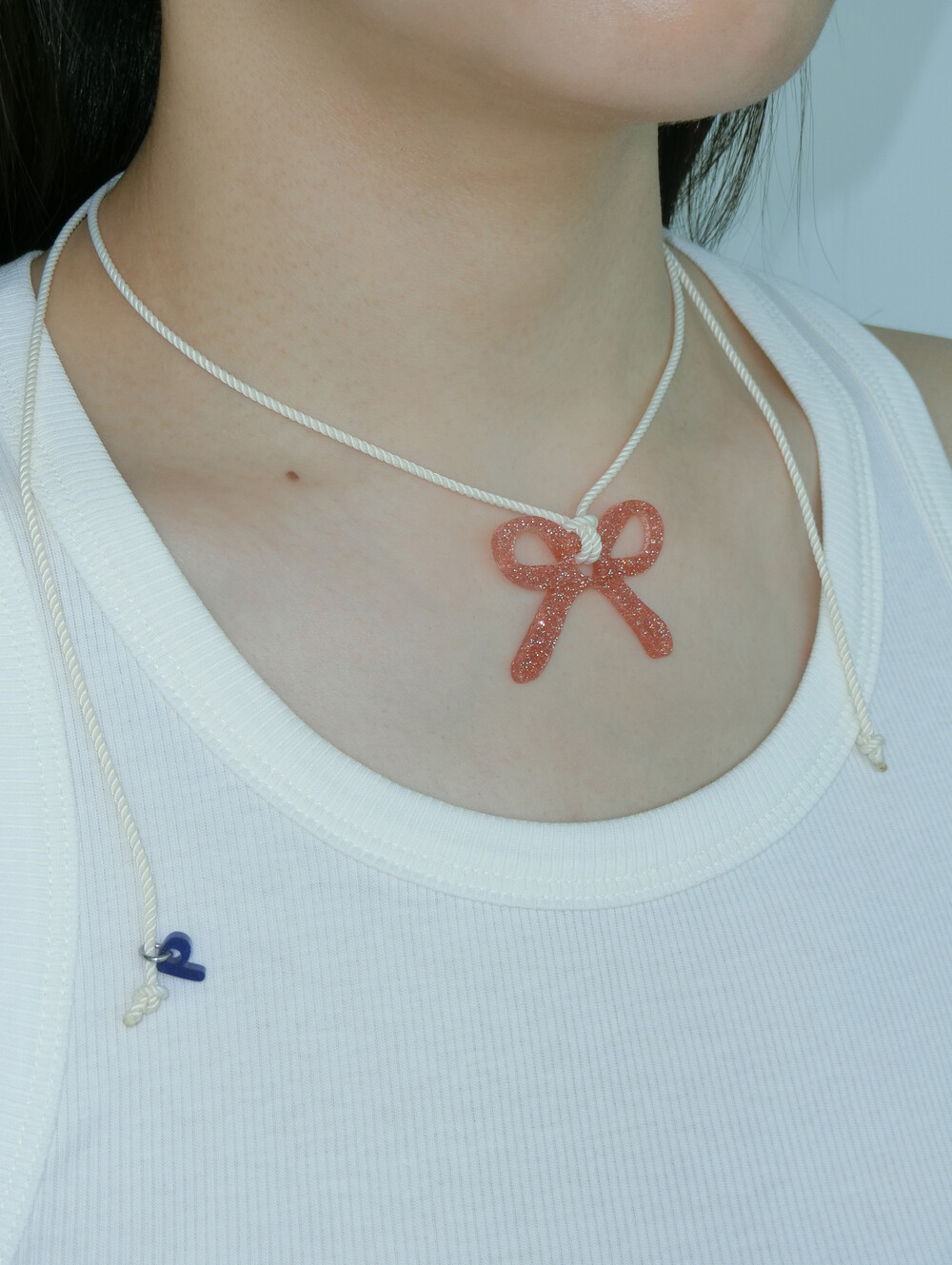 가벼운 소재의 글리터 아크릴로 제작 된 끈 목걸이입니다. 길이 조절이 가능하여 다양하게 연출할 수 있습니다.